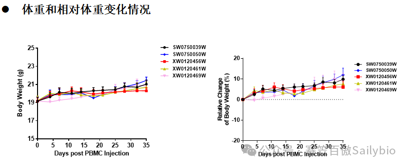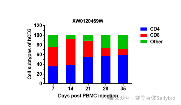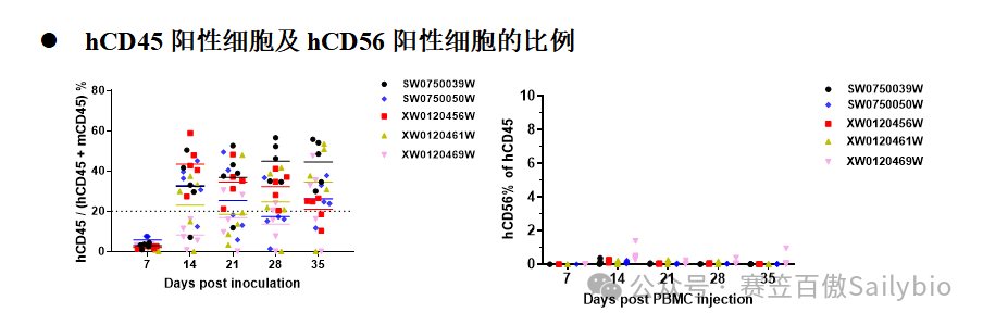 流式测定:在 hu PBMC 接种后第7、14、21、28、35天分别采血做流式检测,检测指标hCD45、hCD56、hCD3、hCD4、hCD8和mCD45。