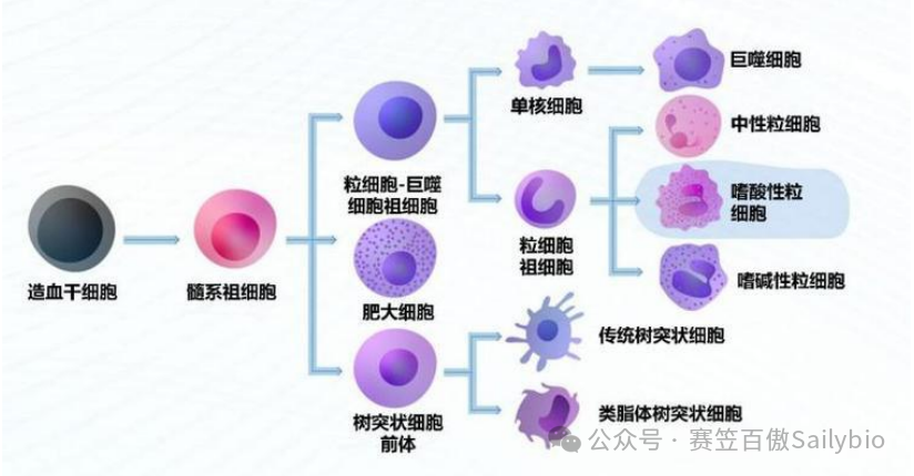 嗜酸性粒细胞起源于骨髓造血干细胞,在粒细胞-巨噬细胞集落刺激因子(GM-CSF)、白细胞介素-5(IL-5)、白细胞介素-3(IL-3)等细胞因子的调控下分化成熟,随后释放入血,再迁移至全身各组织(如呼吸道、胃肠道、皮肤等)发挥生理功能。